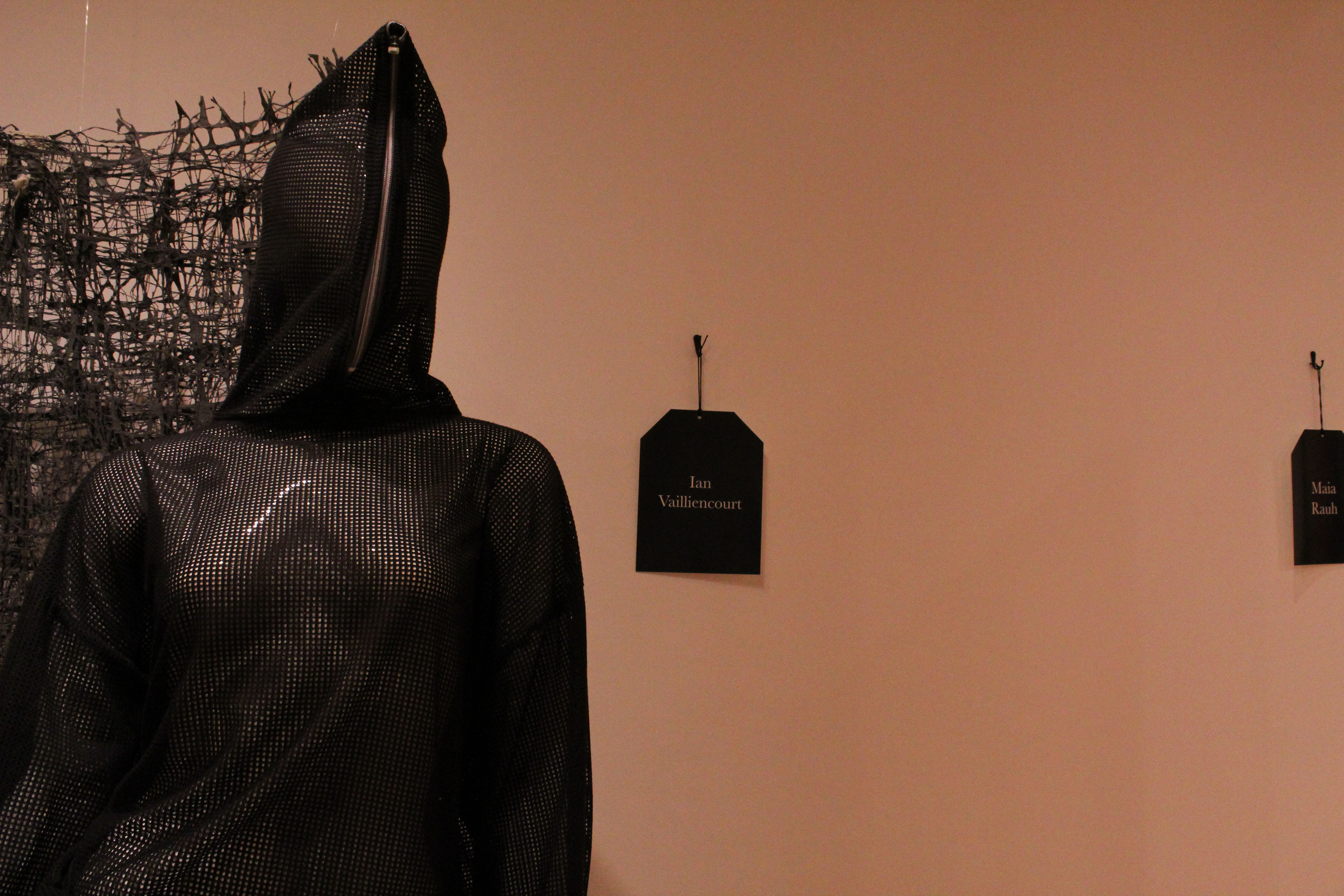 On top, my exhibition in its entirety. On left, me with my exhibition. On right, "Mesh Hooded Long Sleeve" close-up.